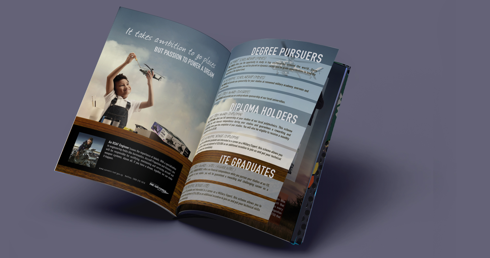 The publicity of an organisation such as the Republic of Singapore Air Force has to be handle with care. That didn't mean creativity couldn't thrive, opportunities had to be sought out for the magic to happen. Education was a big part of the publicity that was done. Learning about the product and the organisation was a huge part in the design process.